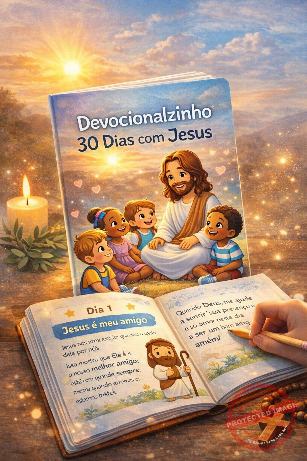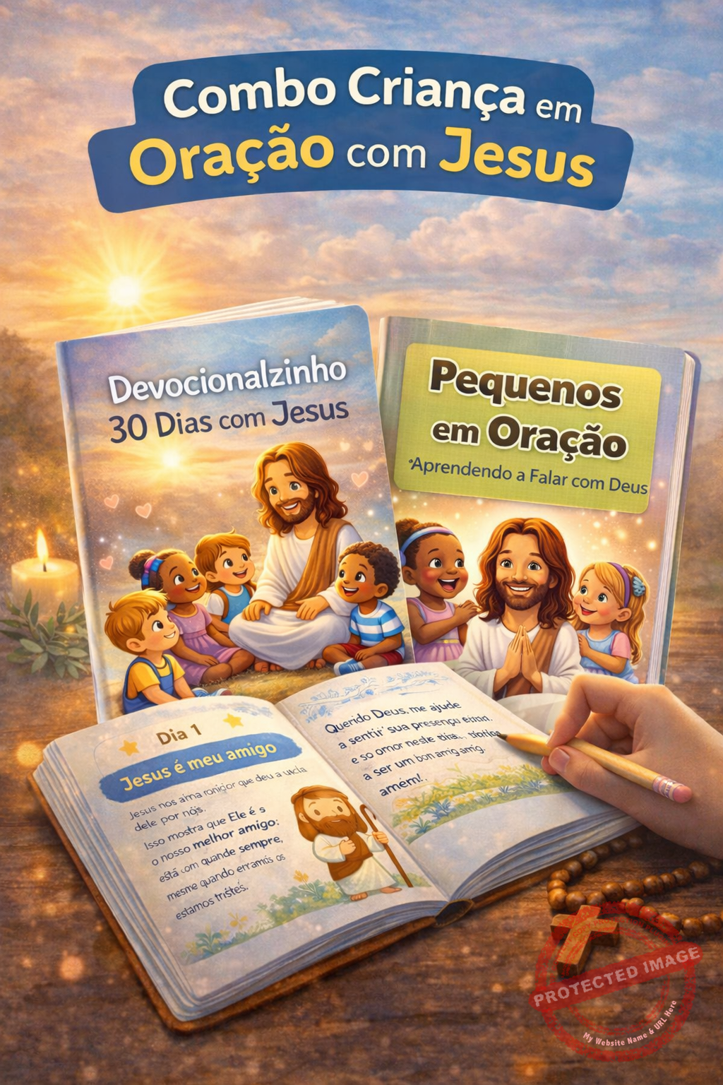 O Combo Criança em Oração com Jesus foi criado para ajudar pais e mães que desejam introduzir a oração infantil e o devocional cristão para crianças de forma simples, leve e adequada à rotina da infância.
