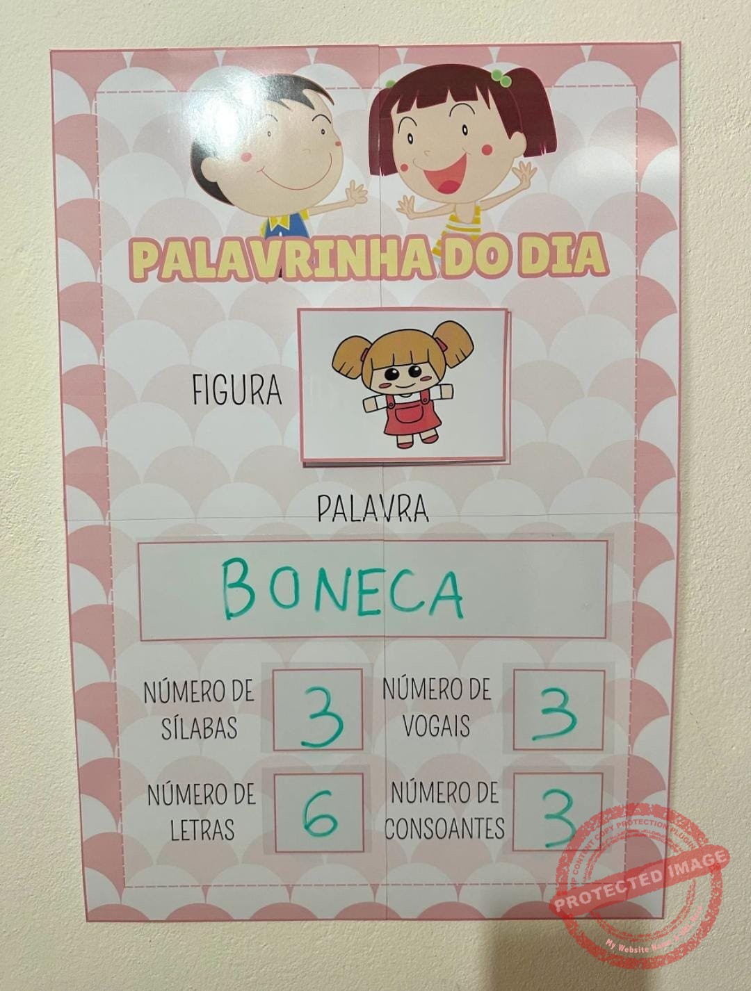 O arquivo possui 26 páginas, contendo o cartaz já ampliado (4 folhas A4), inclui uma folha de registro individual para cada criança reproduzir a análise da palavra, e 84 cards com sugestões de palavras para serem utilizadas com o cartaz.